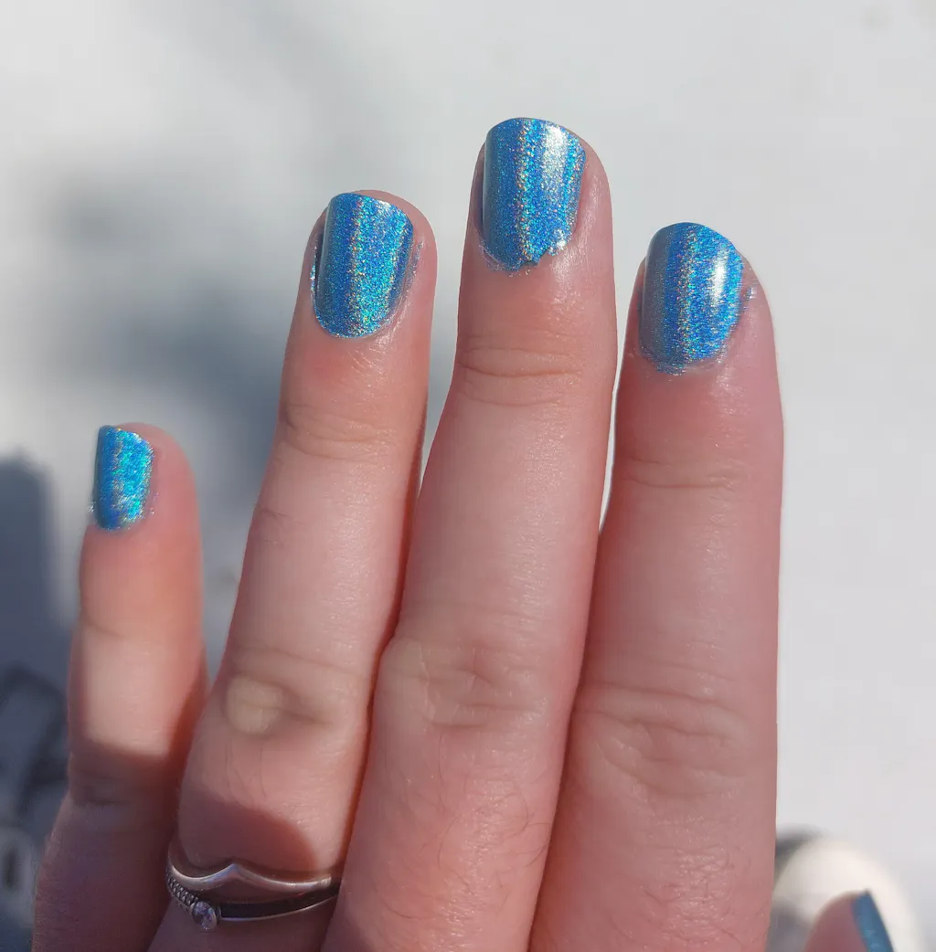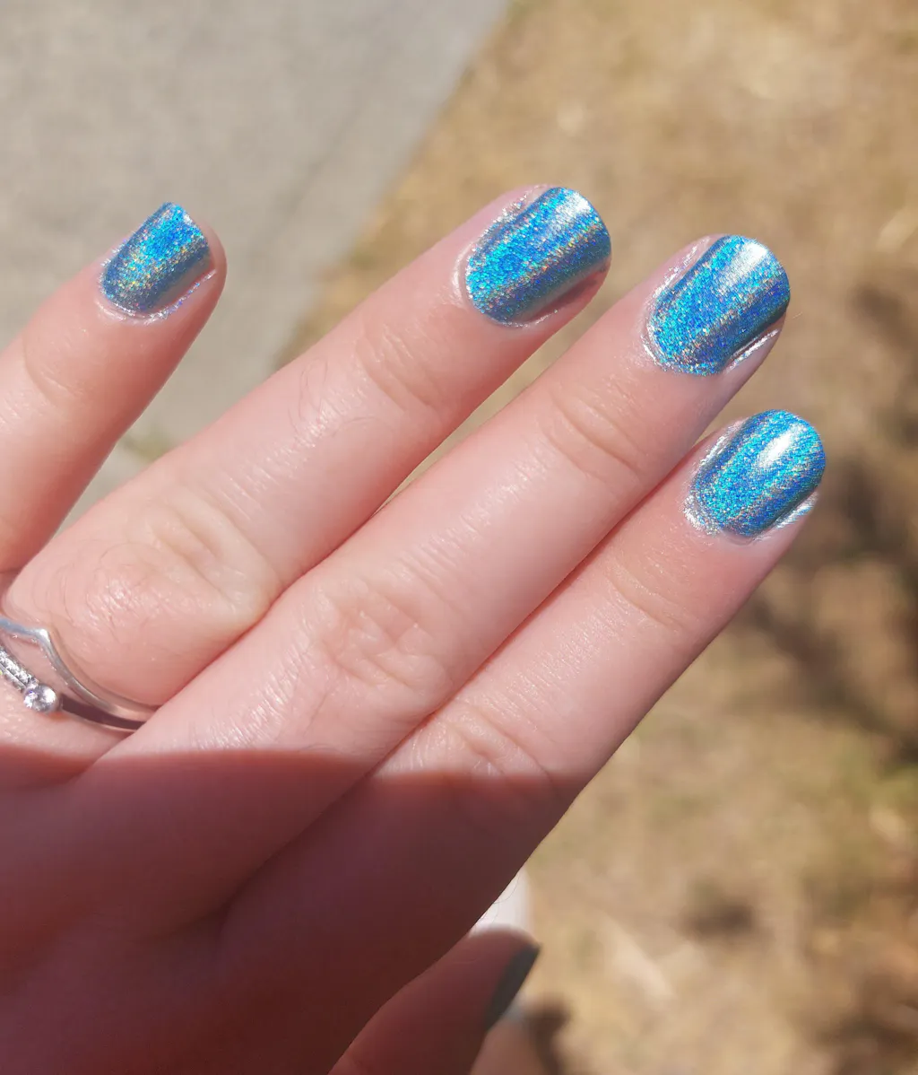 Are your nails giving you the cold shoulder? Illuminate and chill at night with Cosmic Frost, a cyan linear holographic polish.  2-3 coats for full opacity.